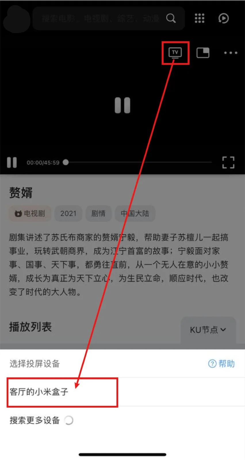 打开QQ浏览器(会接管网页播放器)->打开内部视频->播放视频->选中投屏图标->等待搜寻出智能电视/电视盒子->选中,即可投屏。
